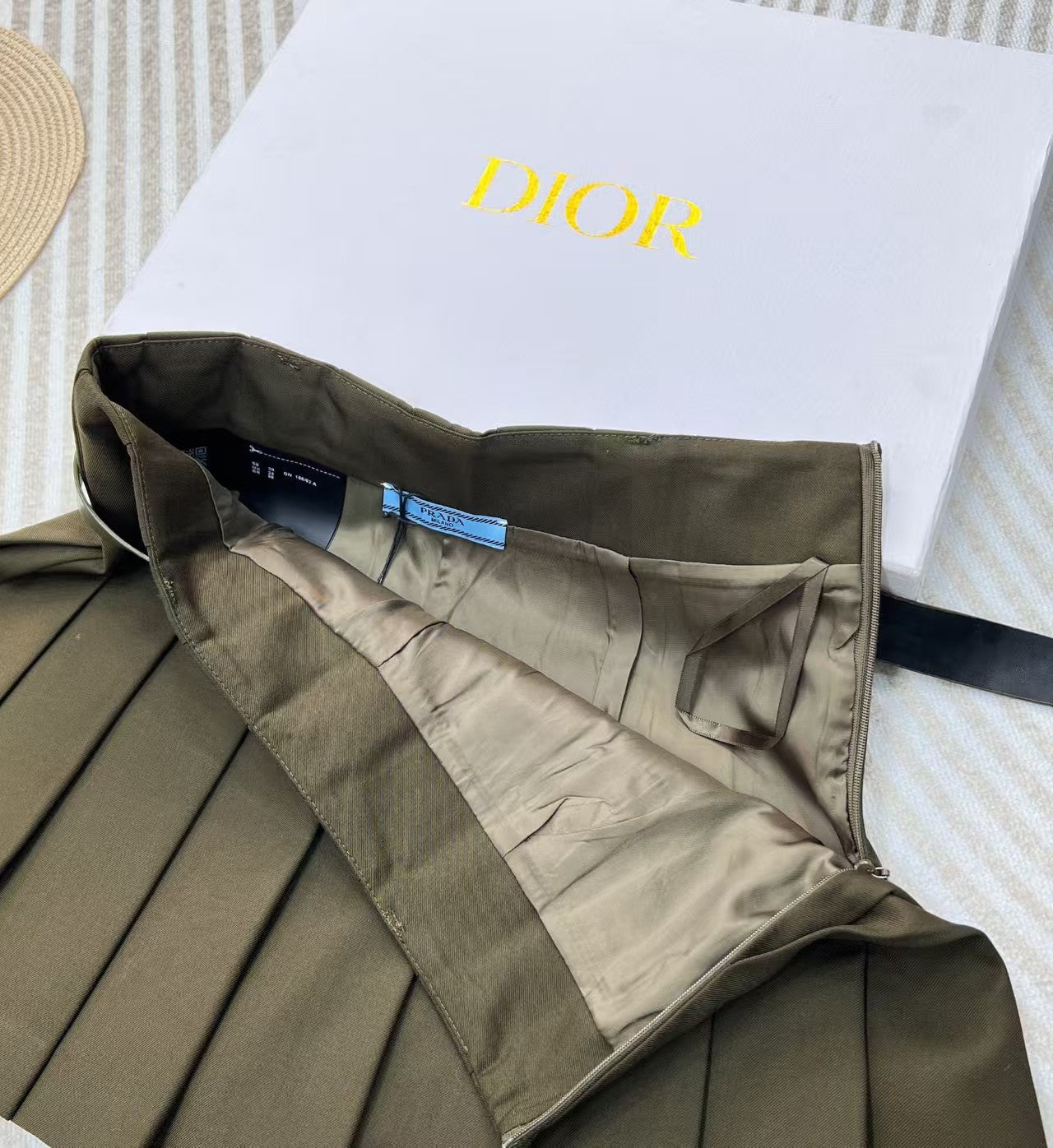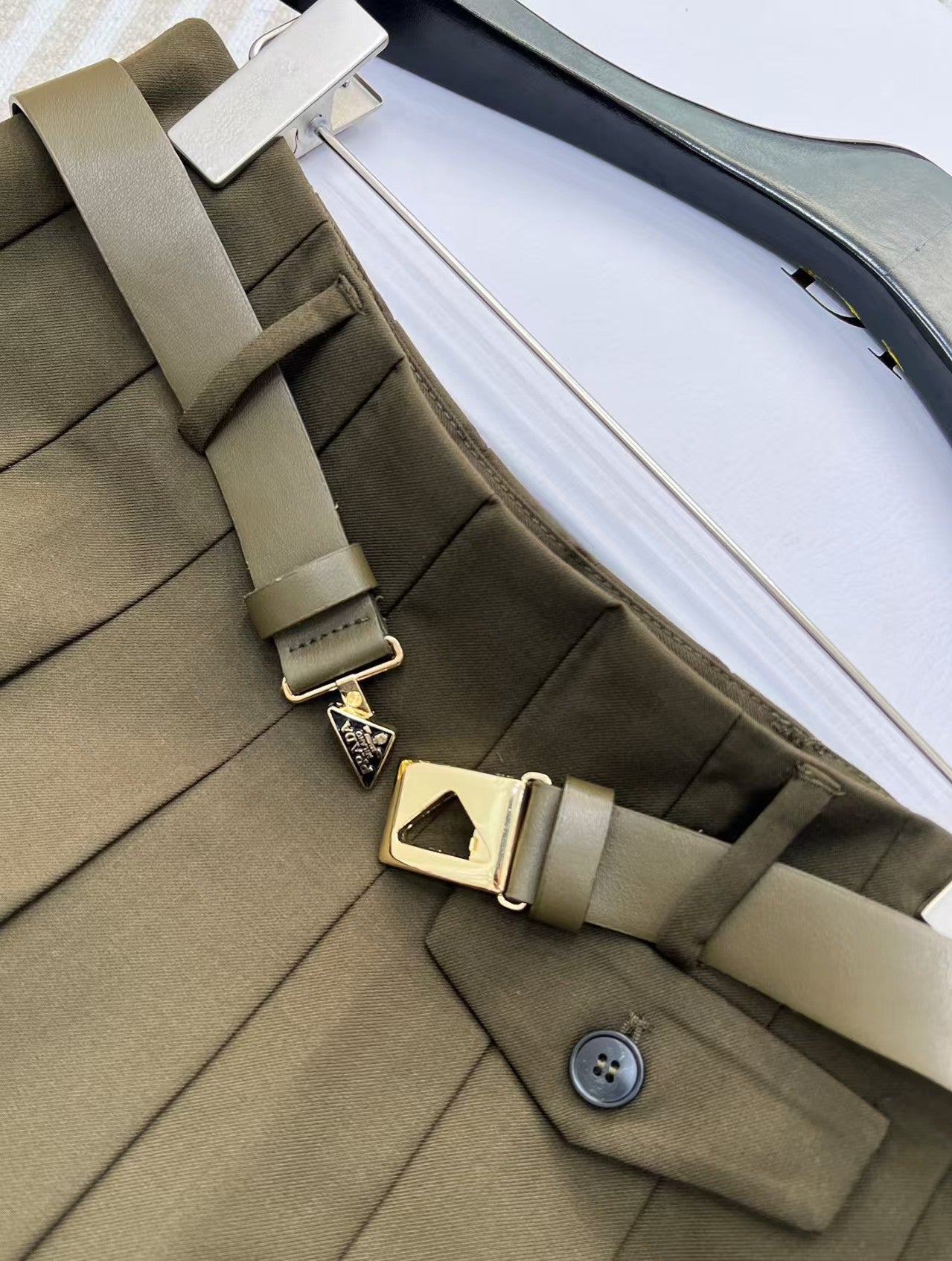 Army green belted pleated skirt. New for early spring. A classic pleated mini skirt with a casual, functional style. A pleated mini skirt that adds new details and meaning to a feminine silhouette. This gabardine mini skirt features button flap pockets and a leather belt with an engraved logo buckle. It's a classic with a modern twist. It's versatile, lined, and comes with a belt.