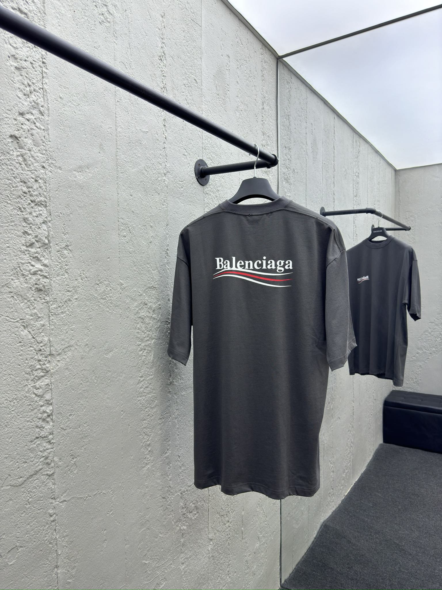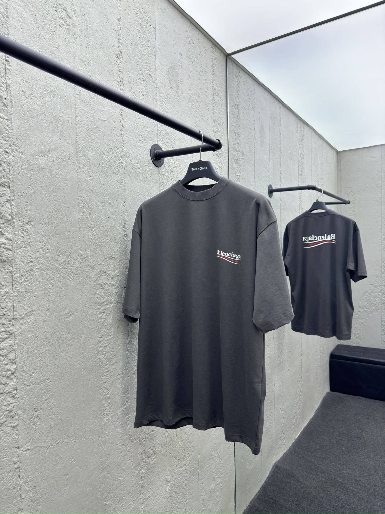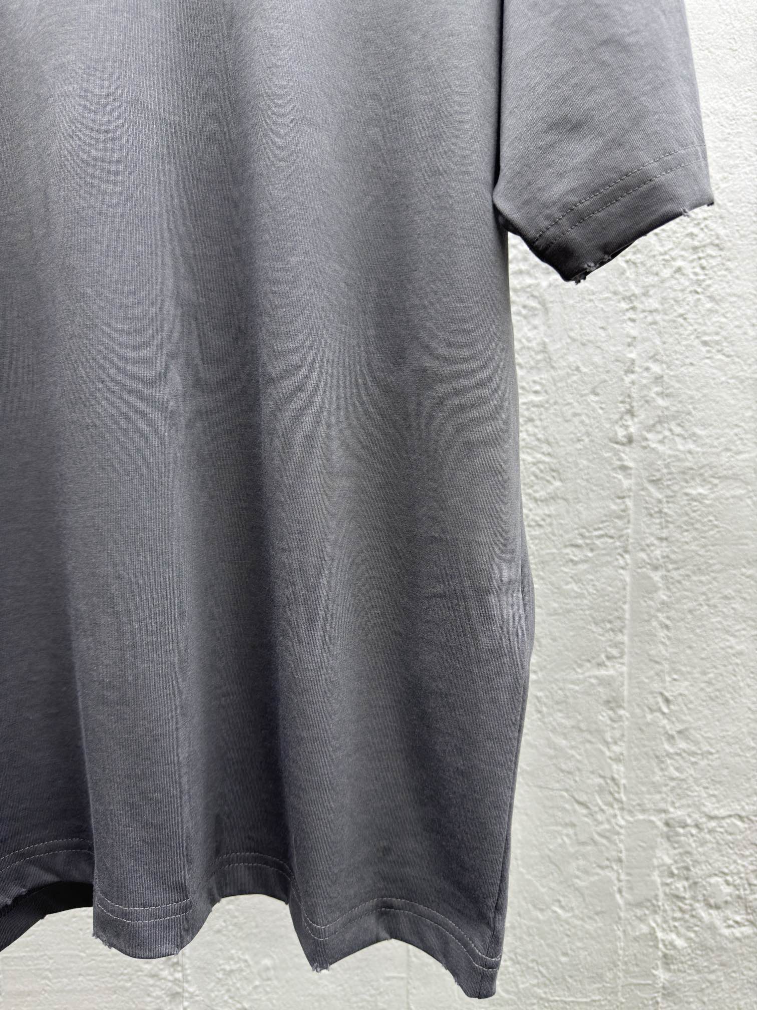 Frayed neckline. Ribbed fabric. Custom-woven and dyed. The color is the same. No color difference. Custom-woven and dyed.100% cotton fabric. The sleeves and hem are frayed.letter logo