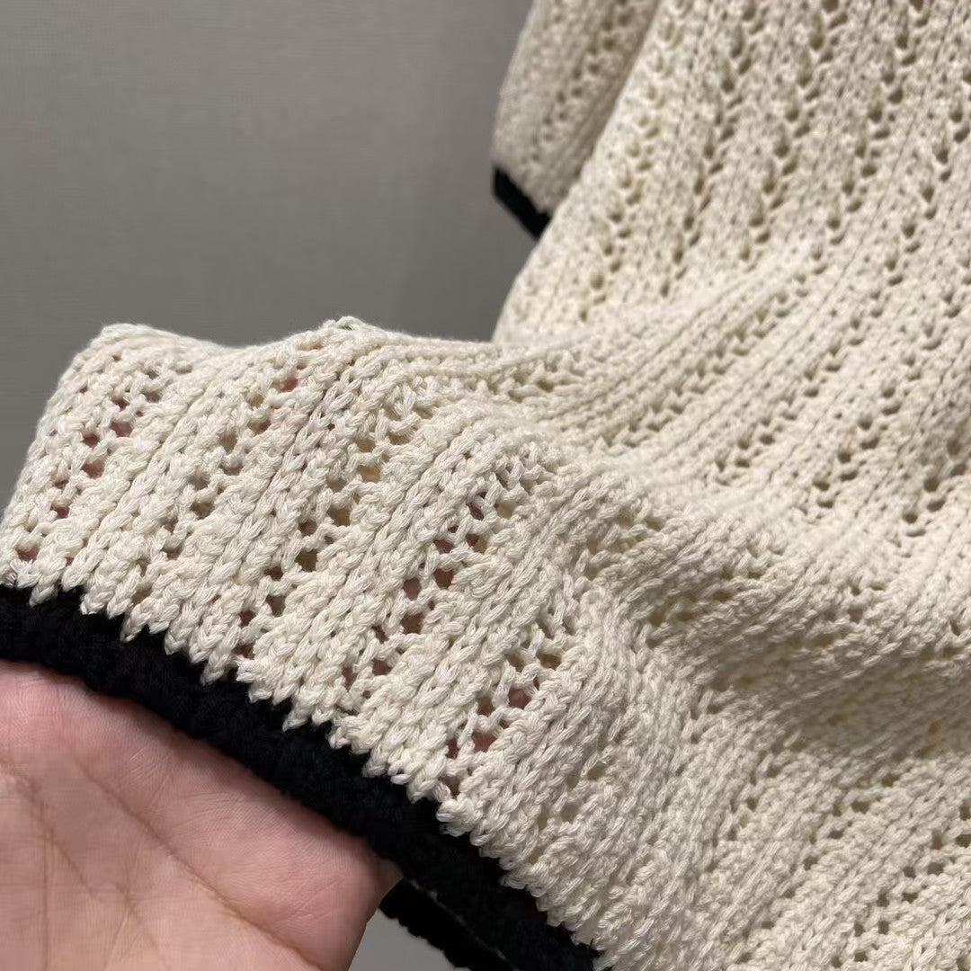 New summer style for 2025. Contrast color round neck knitted short sleeves. Hollow crochet texture interweaving throughout. The collar thread echoes the hem, giving off a sense of literary ladylikeness. A three-dimensional double C embroidery pattern is added to the chest to highlight the high-end feel of the outfit. The elasticity makes it more refined and makes you look slim. It can be worn alone or layered. It is the first choice for fashionable outfits in all seasons.