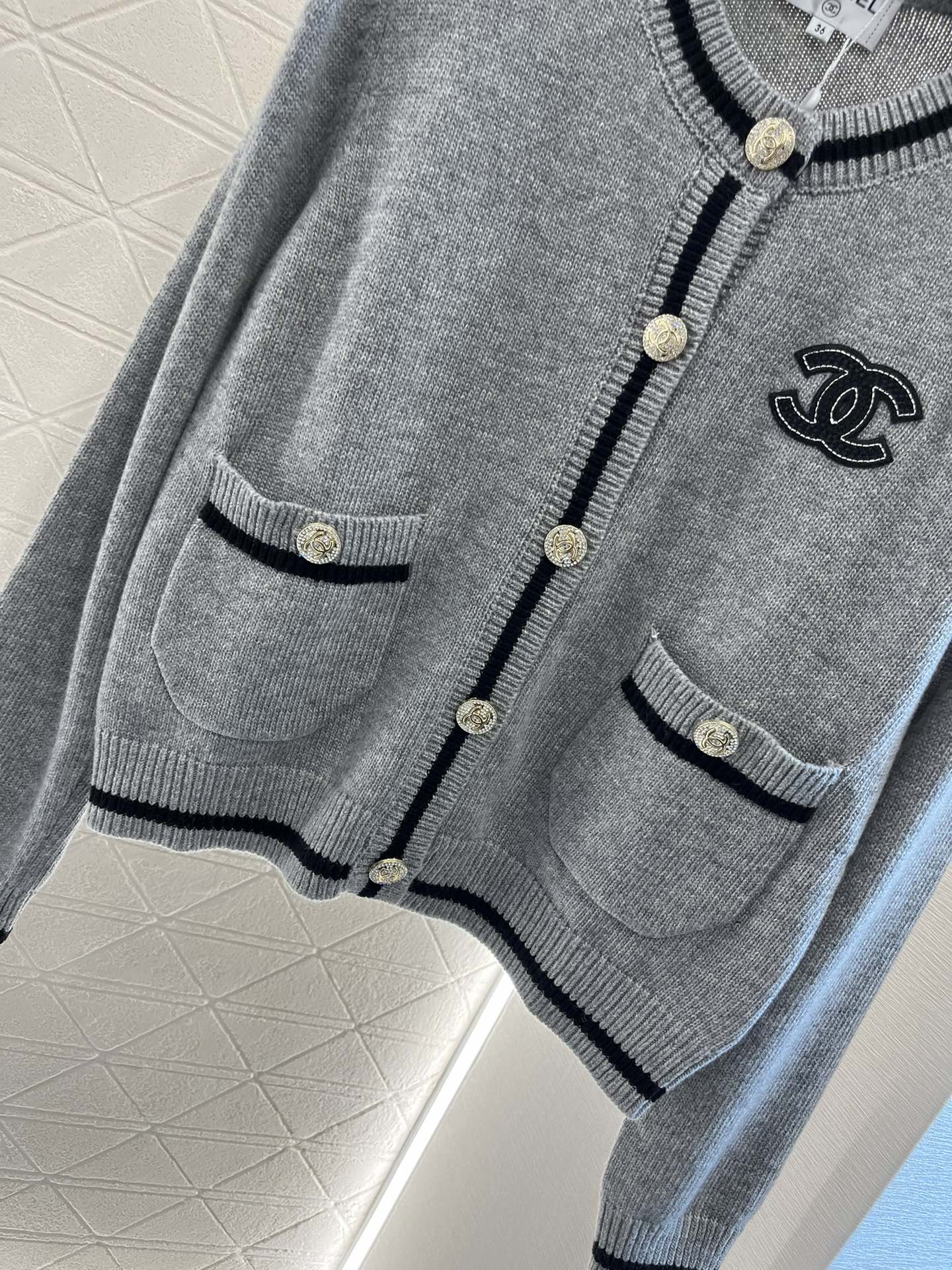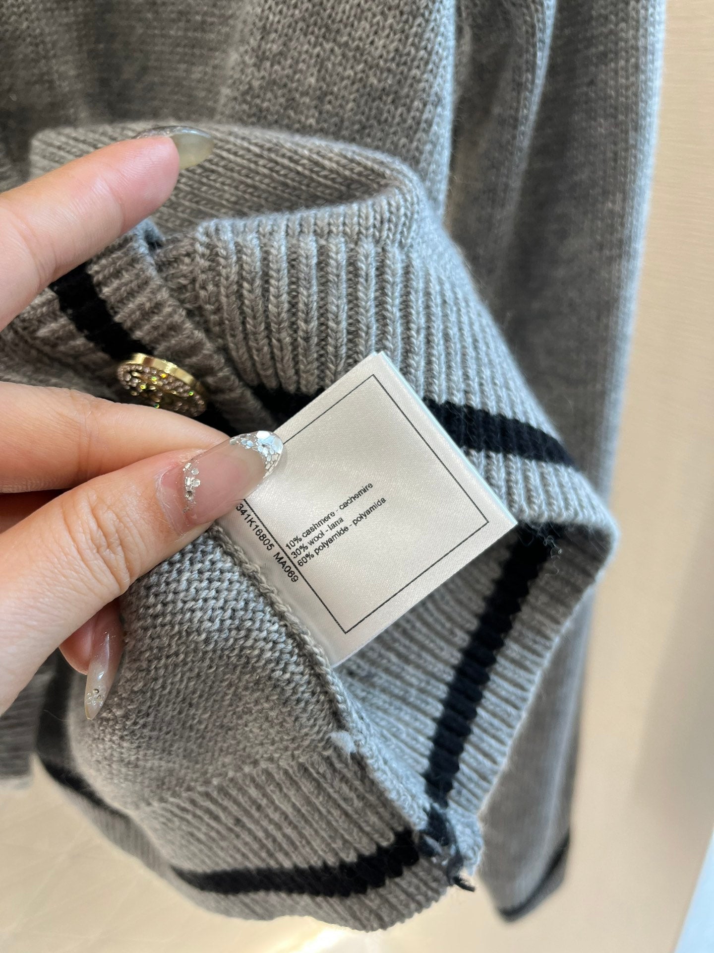 Woven with wool yarn, soft and comfortable, stylish and slimming. Round neck cardigan cut, decorated with hemming stripes. Choose classic black and gray color matching, full of exquisiteness. Logo crochet embroidery letters on the chest, with symmetrical pocket design, showing temperament college style, adding youthful atmosphere to the upper body, perfect for layering in autumn and winter