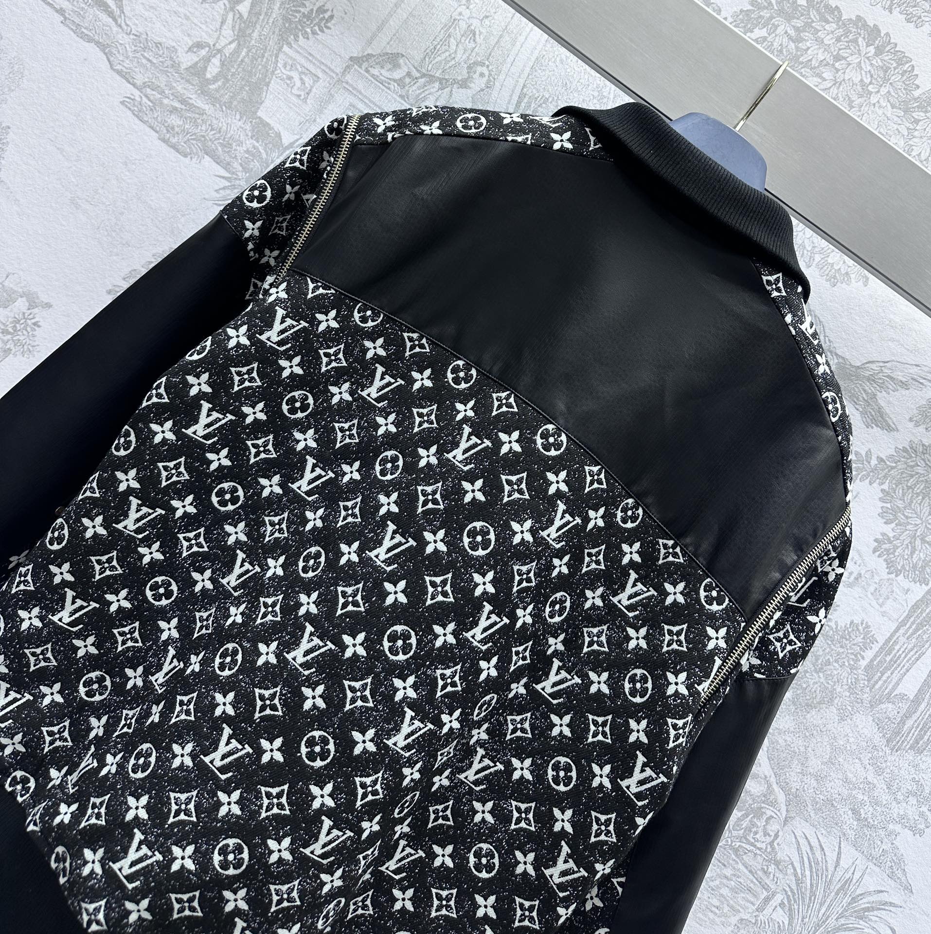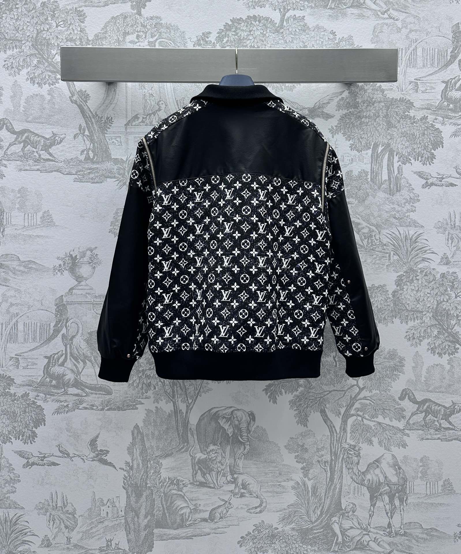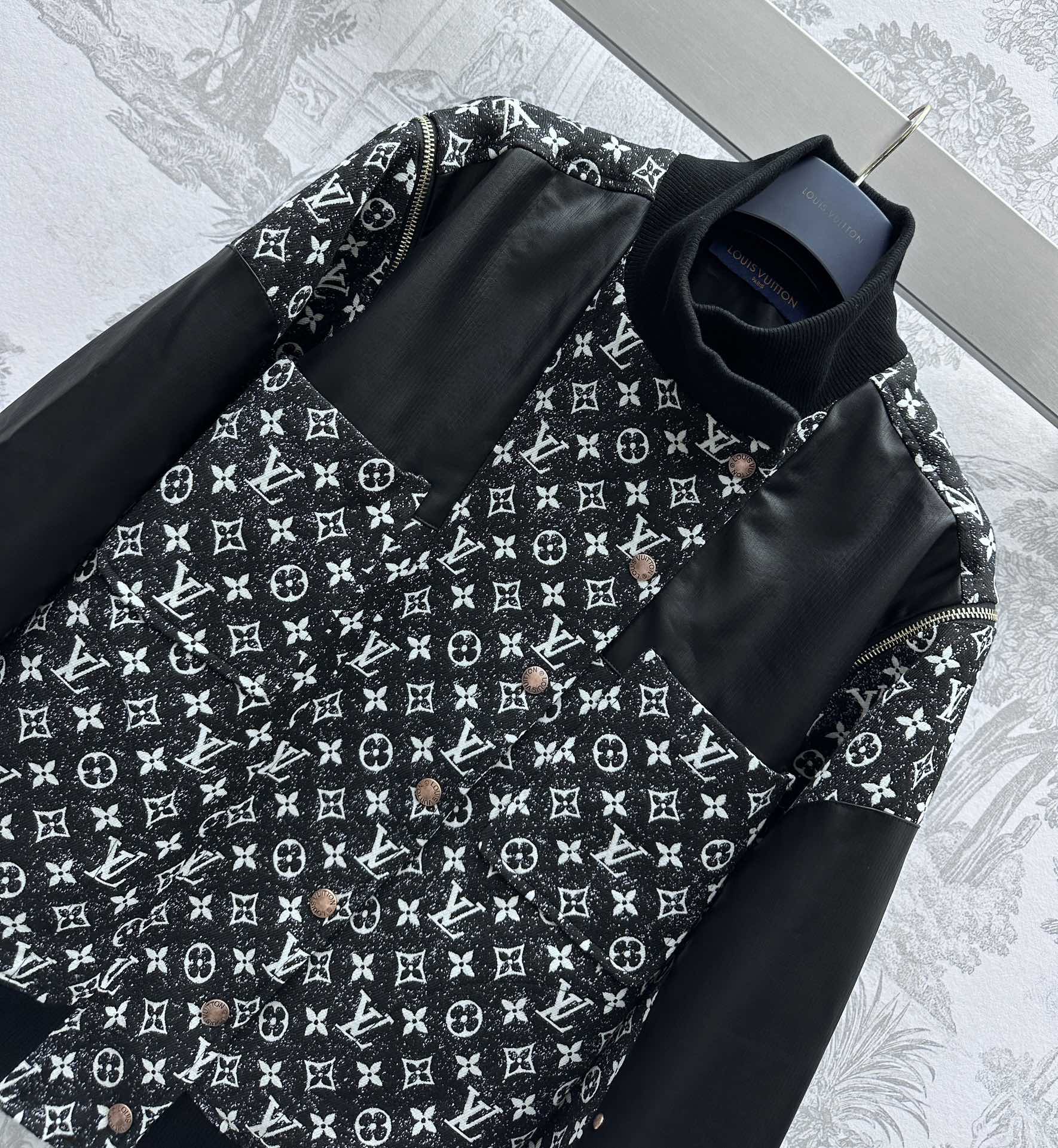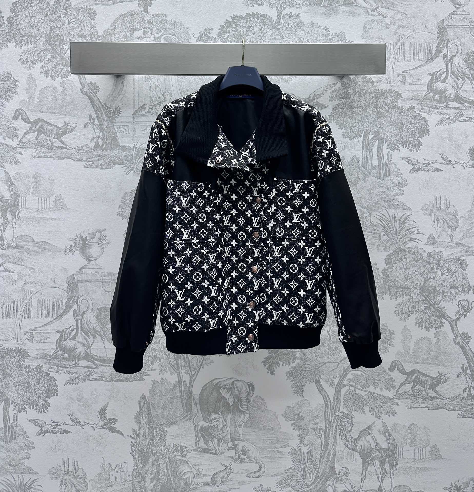 Two-way leather jacket, multiple washes, soft and comfortable, good breathability, decorated with full-print monogram pattern, leather contrast design, presenting a retro style, surface and accessories development, stand-up collar jacket cut, high-end upper body temperament, two-way design, detachable sleeves, instantly turned into a vest, making the ready-to-wear performance more outstanding, very good tolerance and body shape modification, can be controlled by tall, short, fat and thin, high-end tone is clearly visible, can be matched with a series of skirts