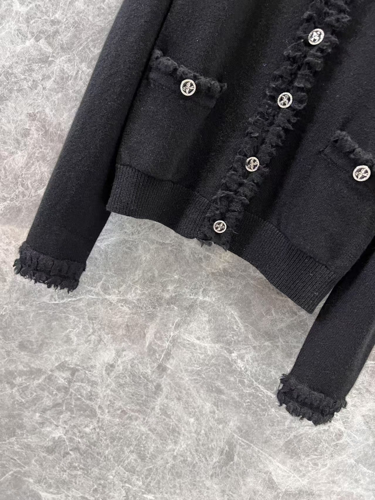 25ss early spring new single-breasted lace knitted cardigan round neck knitted cardigan tailoring Dense texture pattern base all over the body + collar cuffs and hem lace outline The classic black and white color scheme with a sense of wealth makes the style more noble Double C flying fish round button decoration highlights the brand personality Highlights the high-end sense of wear Elasticity makes it more exquisite Wearing makes you look thinner and shows a relaxed tone Light luxury and fashionable temperament Can be worn alone or layered
