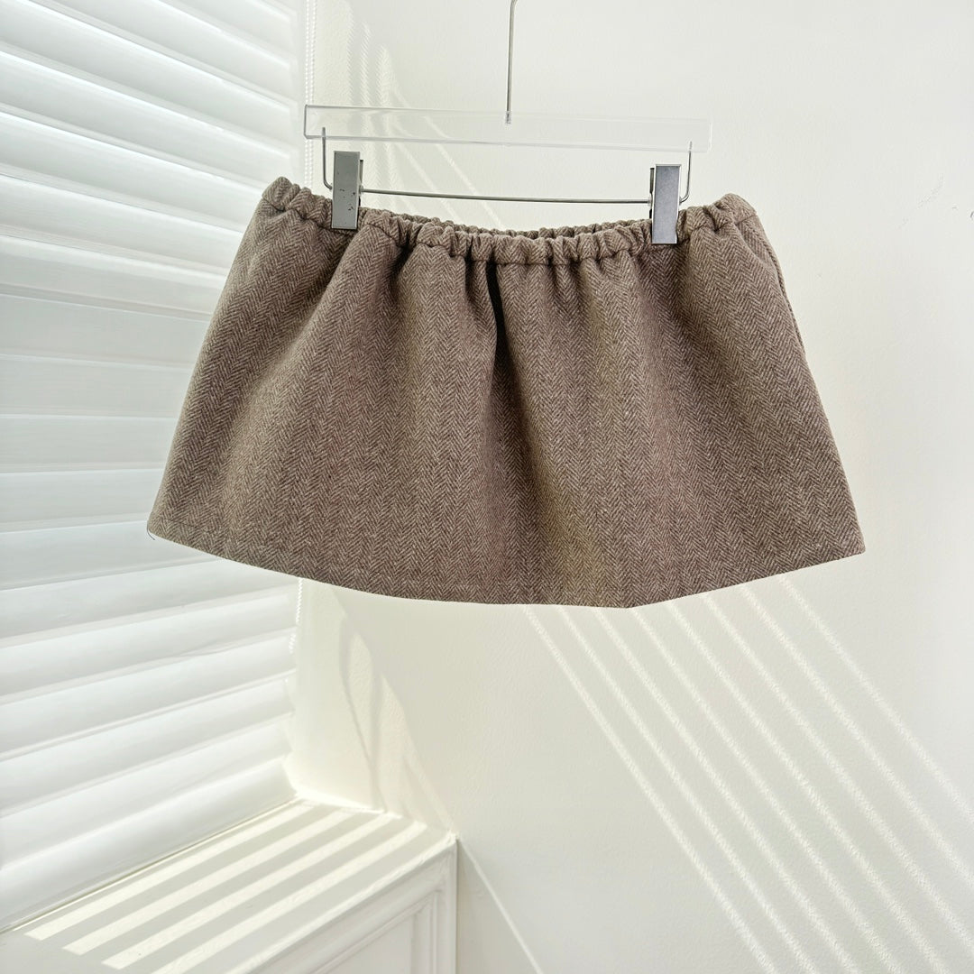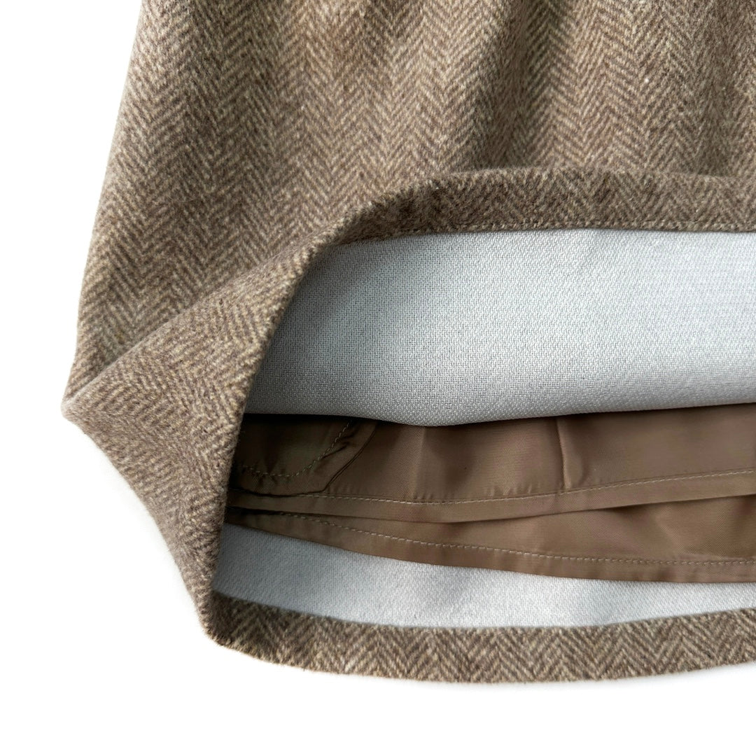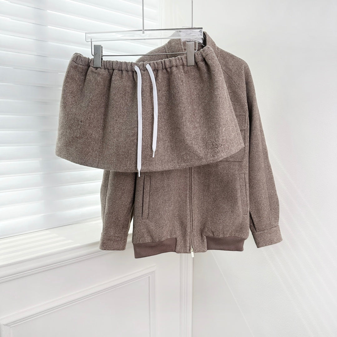 Maillard outfit, oversized jacket with classic herringbone pattern, large flap pockets, embroidered logo as the finishing touch, the same skirt also echoes the jacket logo embroidery, drawstring pocket design, a complete set!