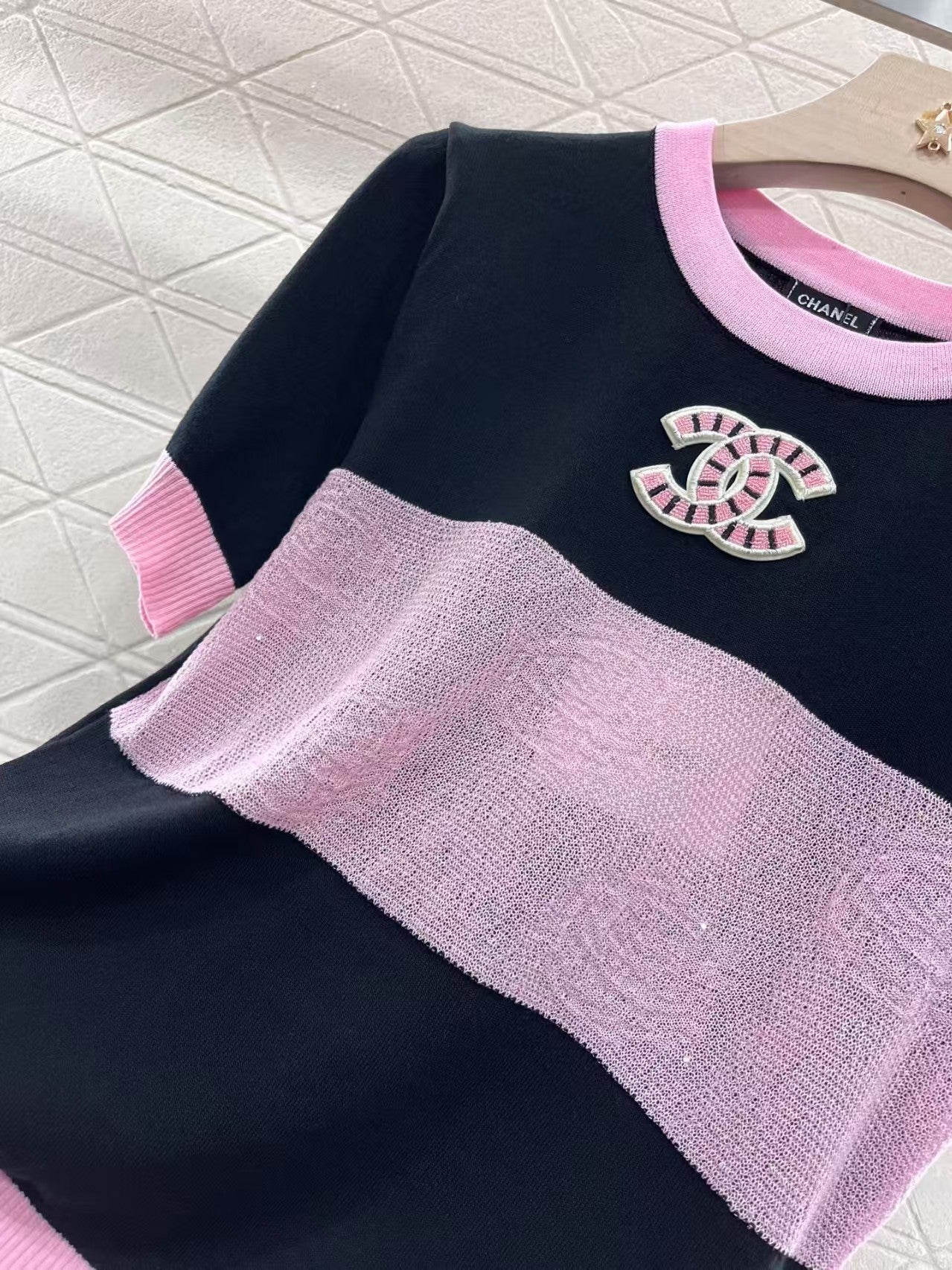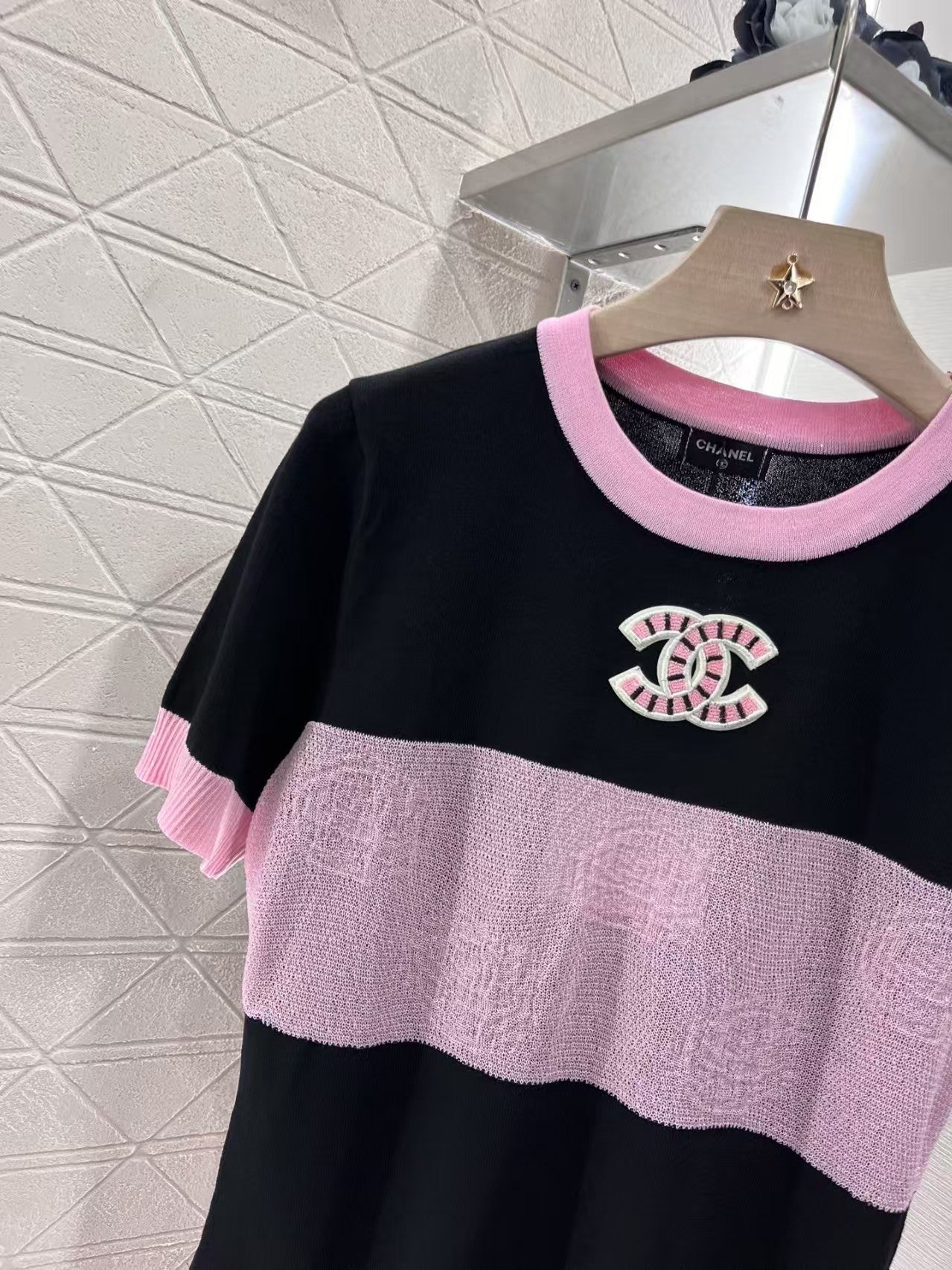 Striped contrast short sleeves Customized YB Tencel yarn knitted short sleeve top pattern Pink and black interweaving Fixed color and dyeing process Perfectly restore the appearance Soft and skin-friendly Comfortable and stylish Round neckline appropriately exposes the skin Beautify the head-shoulder ratio and make you look thinner Double C logo on the chest + camellia crochet pattern decoration Strong luxury style Elastic elastic version highlights the figure Playful and age-reducing whitening Easy to control for daily travel or easy gatherings