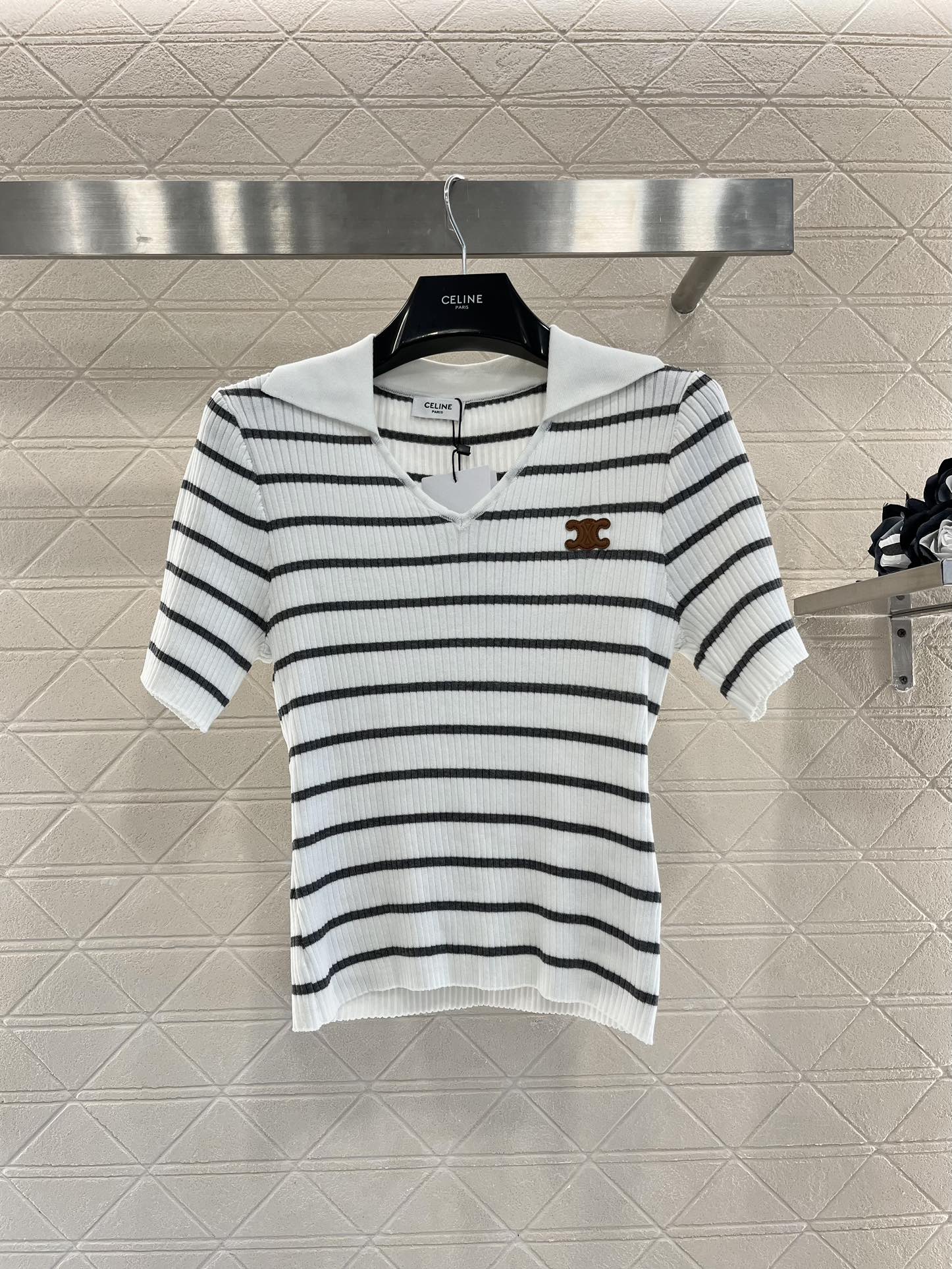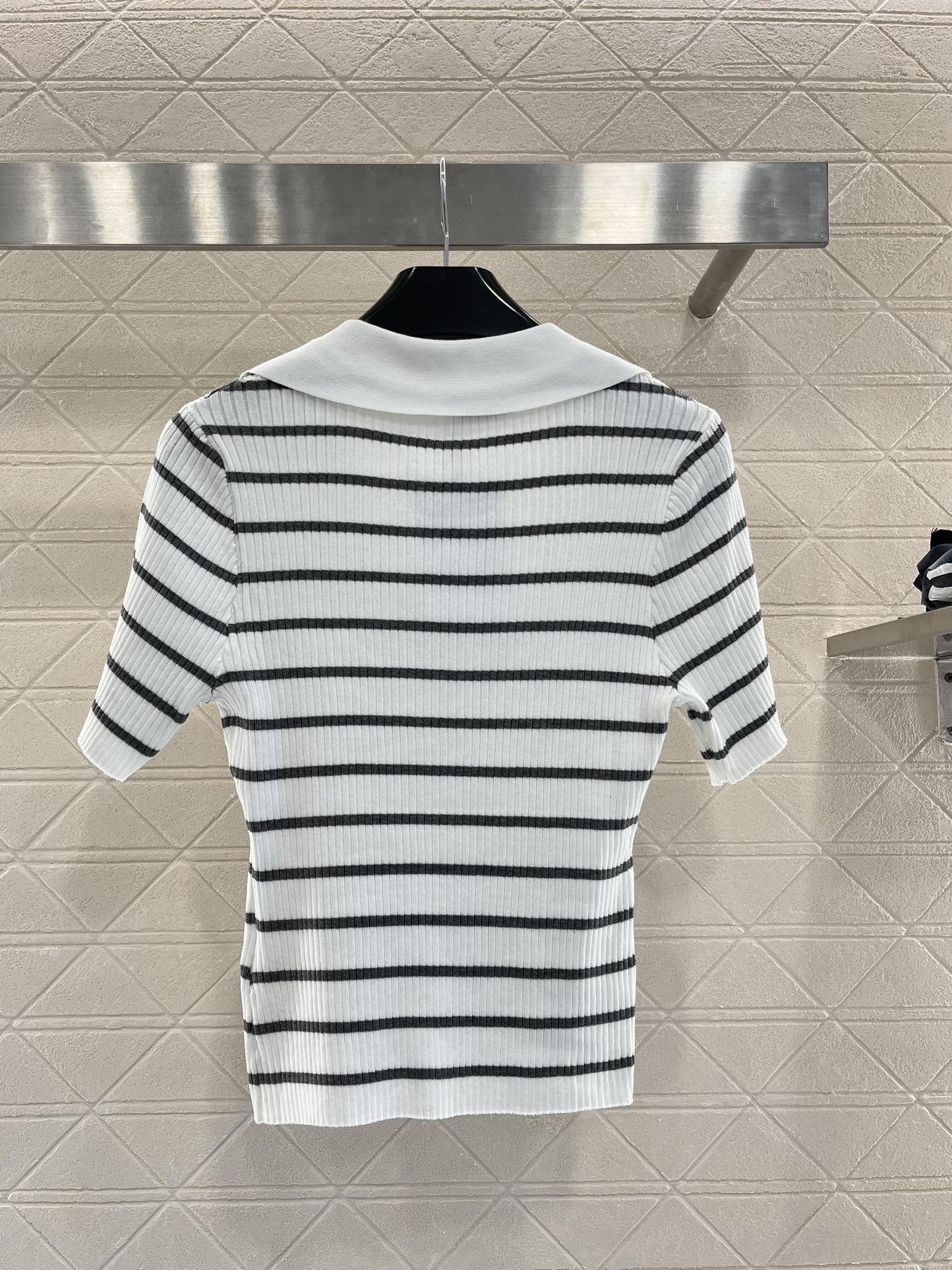 Customized Tencel knitted material, skin-friendly and comfortable, full of texture, lapel V-neck short sleeves, striped contrasting texture, simple and loose, leather label on the left, clearly visible, slim fit, highlighting the figure, well-detailed, suitable for daily commuting