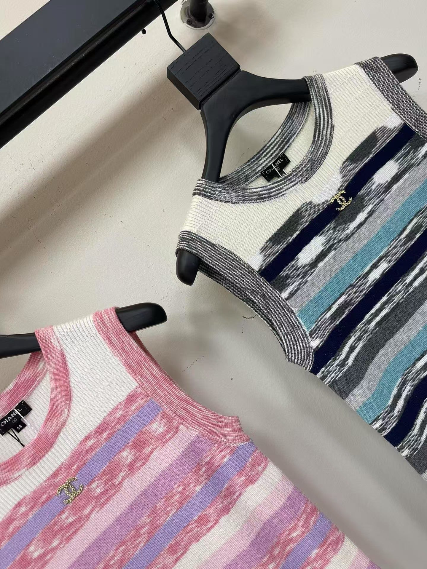 Customized YB wool yarn weaving, fixed color and dyeing, perfect appearance, soft and skin-friendly, comfortable and stylish, sleeveless vest cut, appropriate neckline to expose skin, beautify the head-shoulder ratio and make you look thinner, artistic contrasting stripes all over the body to create a sense of layering, neckline and cuffs are edging with gradient colors, matched with the double C rhinestone logo decoration on the chest, strong retro style, slim fit to highlight the figure, playful and age-reducing, easy to control for daily travel or gatherings