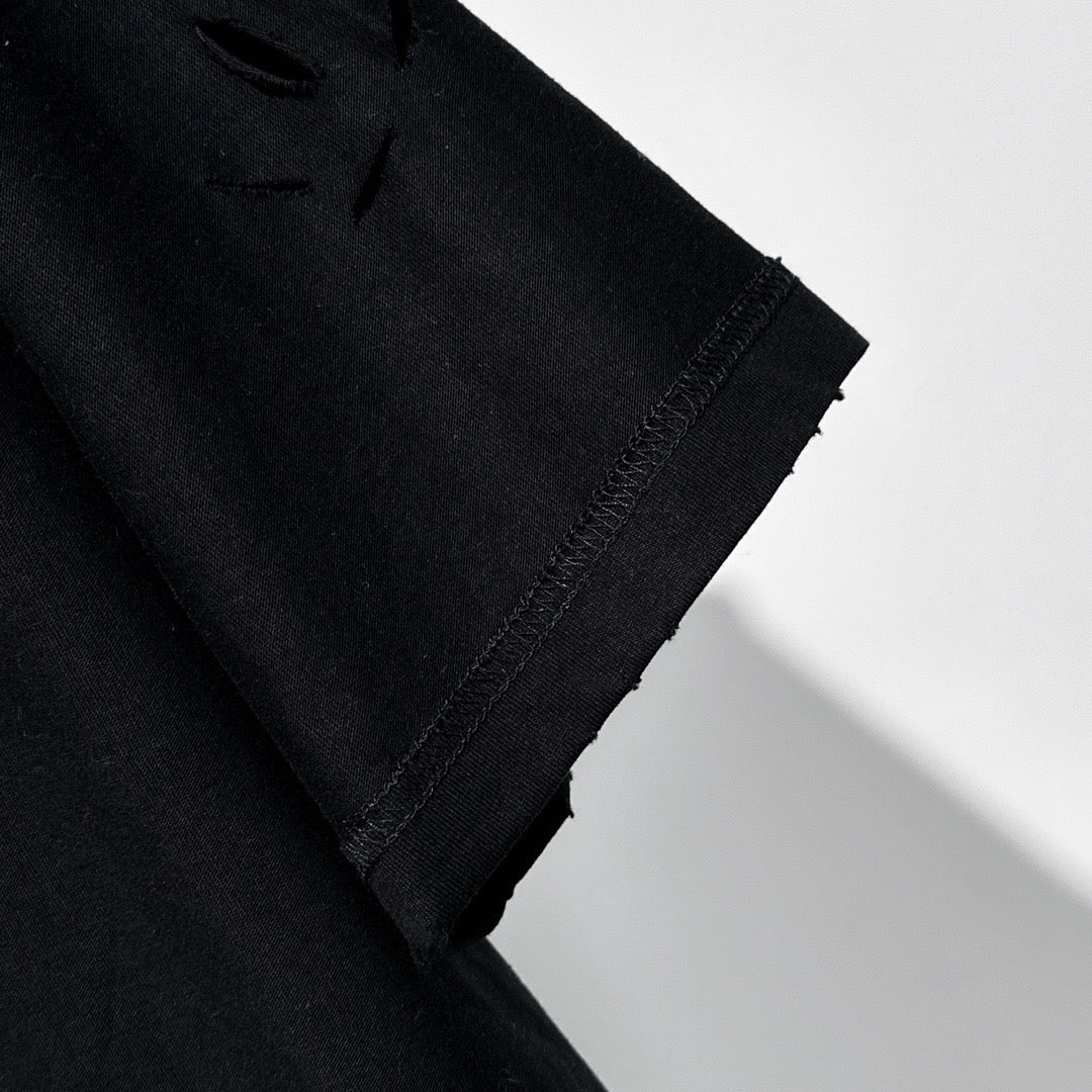 This T-shirt is made of 240g long-staple cotton fabric that is custom-woven and dyed by customers. After color-fixing treatment, the color is warm and soft, and it feels soft against the skin, bringing unparalleled comfort to the wearer! The mirrored letter logo is embroidered on the front, which is made by Produced by Tajima embroidery machines imported from Japan, the fonts are clear and stylish, showing unique artistic charm! This design not only improves the overall visual effect of the T-shirt, but also makes it more personalized and unique! The body is made of irregular handwork The design of cutting holes with a knife, and then sewing and repairing them with imported fur machines, is exquisite in craftsmanship. This design concept breaks through the traditional constraints and shows an eclectic fashion attitude! The loose silhouette and cutting of os make This T-shirt is more inclusive. Whether you are thin or plump, you can wear it in your own style! Ba's unique high collar and inside-out design make this T-shirt full of trend. breath