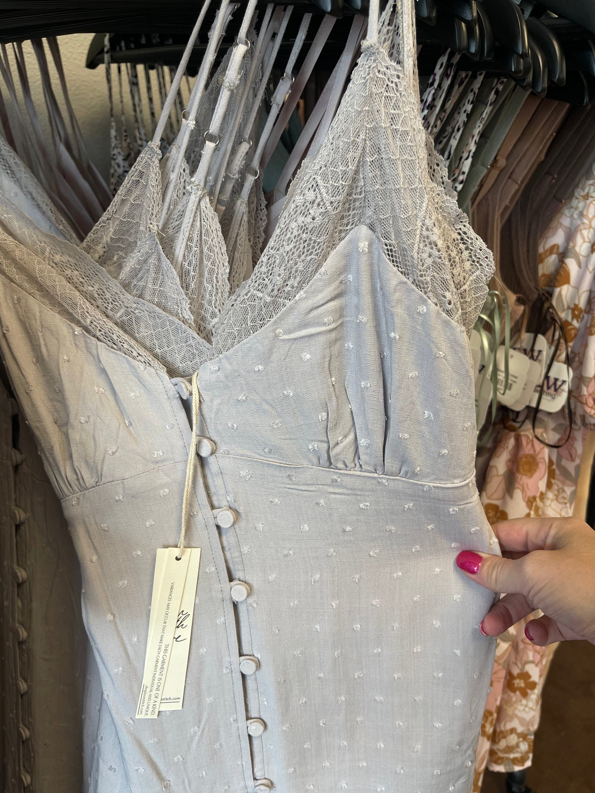 Inspired by lingerie but designed for outside the bedroom, our sexy slip maxi dress is perfect for any special occasion. Featuring a delicate lace trim v-neckline & back v-neckline, and a tie-back detail for waist definition. Style it with lace-up boots and layer it under a cozy sweater for a chic cool-weather vibe. Model is wearing dress in white.